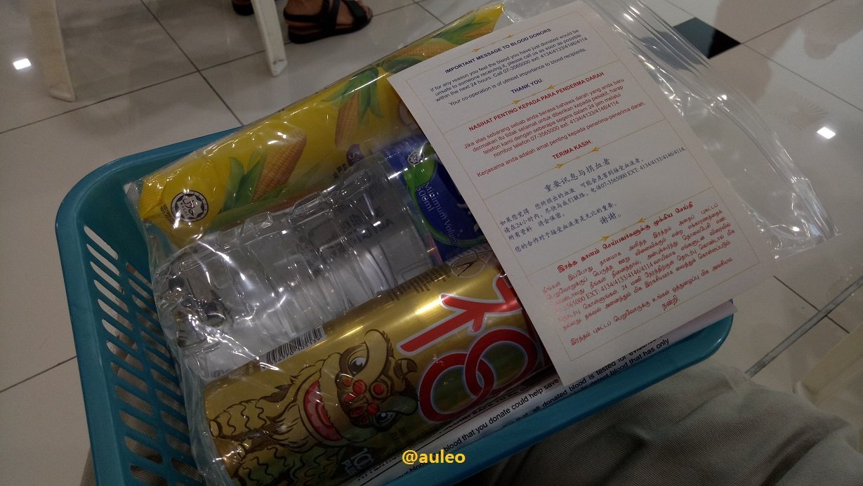 在新加坡捐血后,休息处会有许多饼干饮料任拿任吃;而大马就没这回事,配给一条面包、一罐100号与一瓶矿泉水而已。