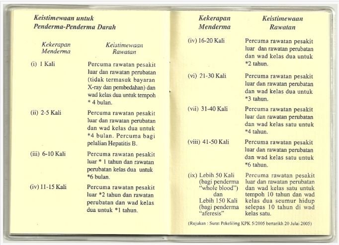 但在马来西亚捐血有个显著的好处,就是随着捐血的次数,政府会给与相关的住院费与医药费免费(列表),虽然仅限于政府医院,但是对大多数人而言,是个很好鼓励大家行善捐血的动力。